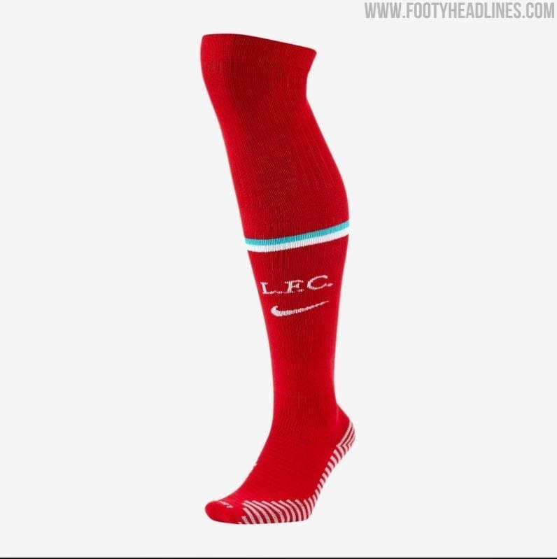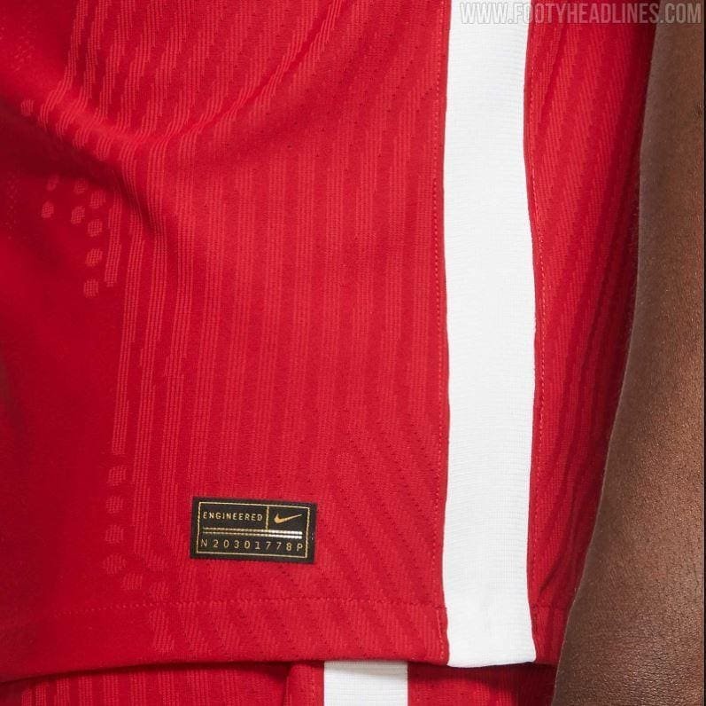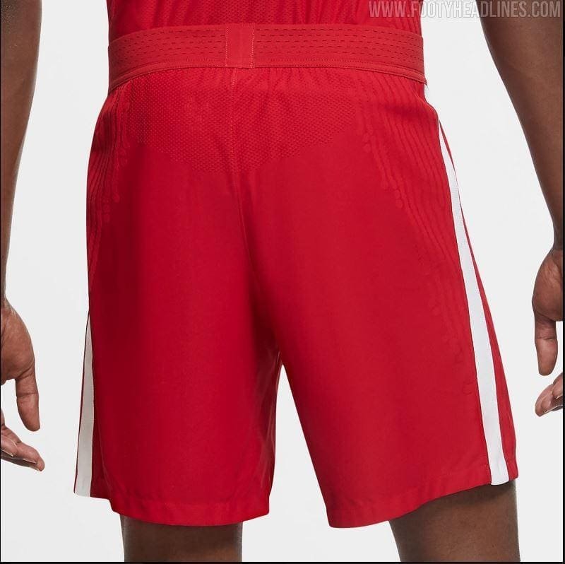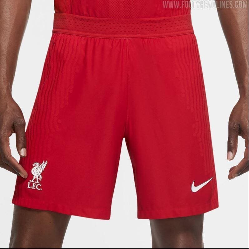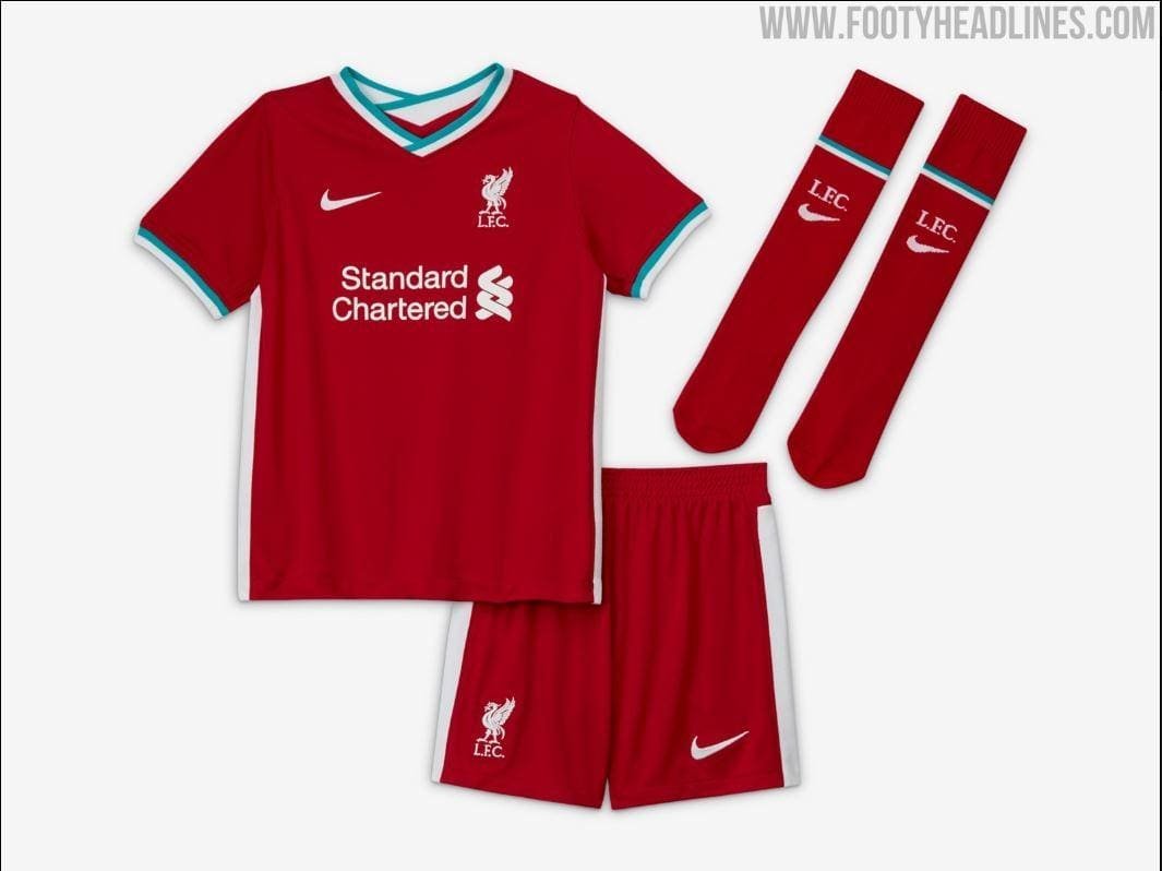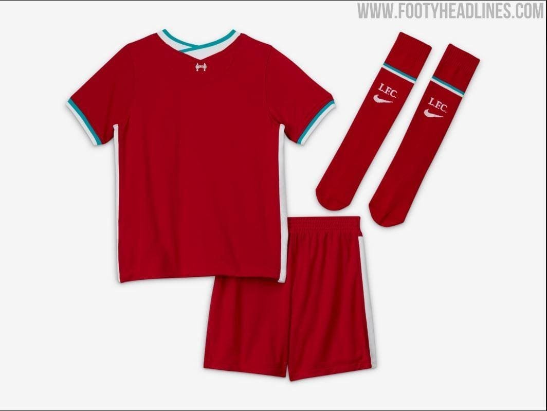Nike combines the Liverpool 2020-2021 home jersey with red shorts and socks.