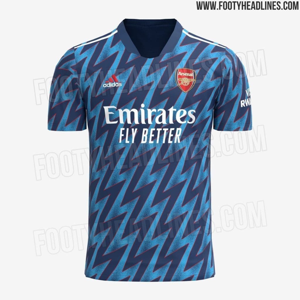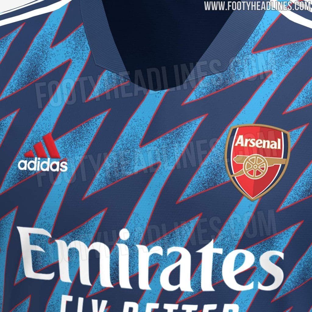 Arsenal 2021/22 third kit, produced by Adidas, has navy blue as its base colour. The shirt also has an almost turquoise zigzag/lightning bolt-like graphic along with white and/or red logos.