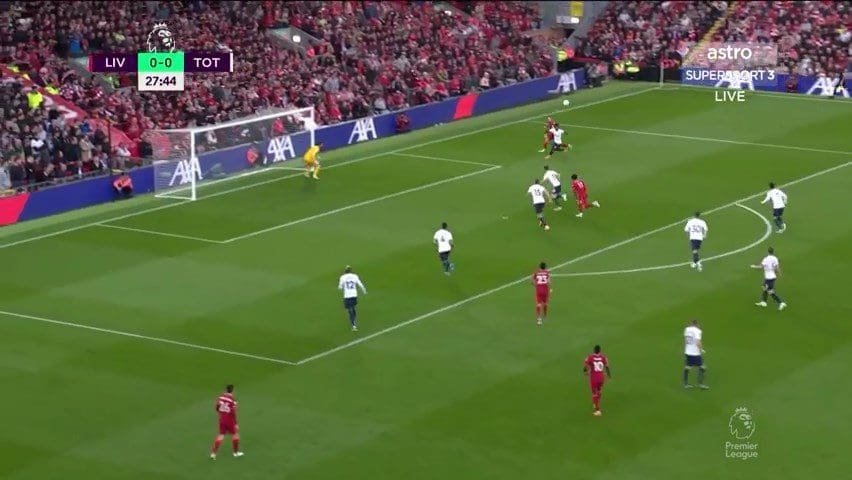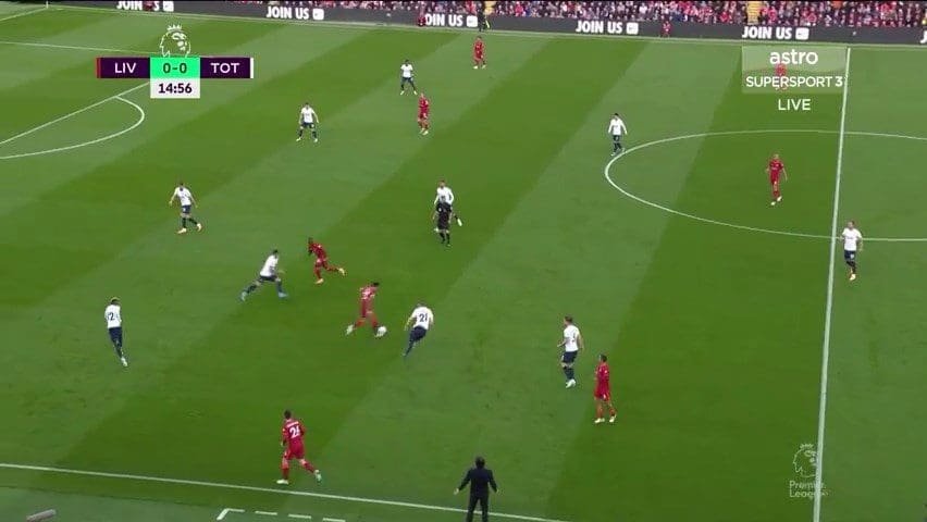 Liverpool on the other hand had one structural flaw that prevented efficient use of space: Mane’s positioning and movement. In his attempts to link play and be involved in move construction, Mane would often drop too close to the wide areas, bringing an extra CB (mostly Dier) with him and clogging space, making it impossible for Liverpool to use the channels or halfspace.