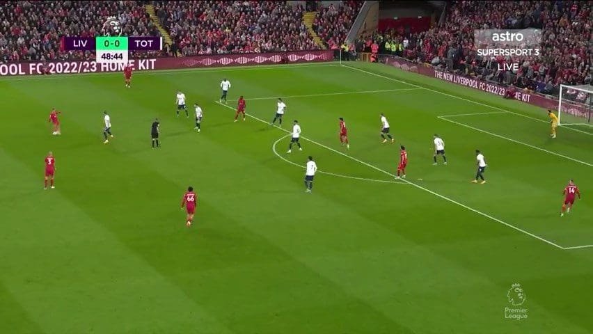 Liverpool’s right side has become more associated with passing combinations and triangles, with Henderson, Salah and Trent forming an impressive synergy on that flank in recent times. But against Tottenham’s defence, their left was more active. Luis Diaz, Mane and Robertson repeatedly tried to pry open Spurs’ defence through passing moves and combinations.