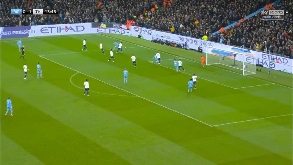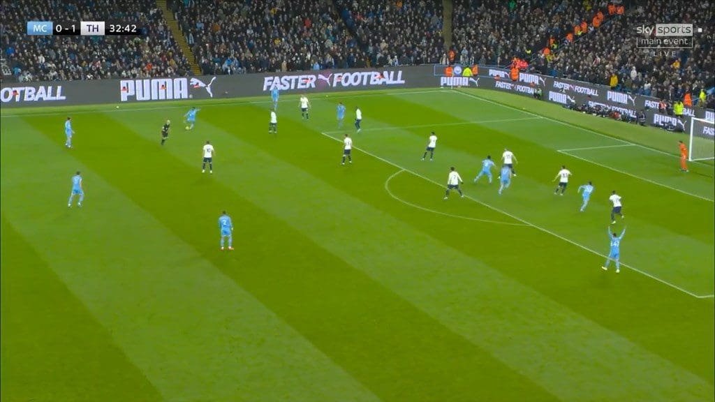 More often Tottenham didn’t press these deeper players to avoid disorganizing their defensive shape, but instead trusted Lloris and the excellent box defending of Romero and Dier to eliminate the threat from these crosses. And, apart from Lloris’ error leading to City’s first goal, Spurs’ defence handled these situations with relative ease.