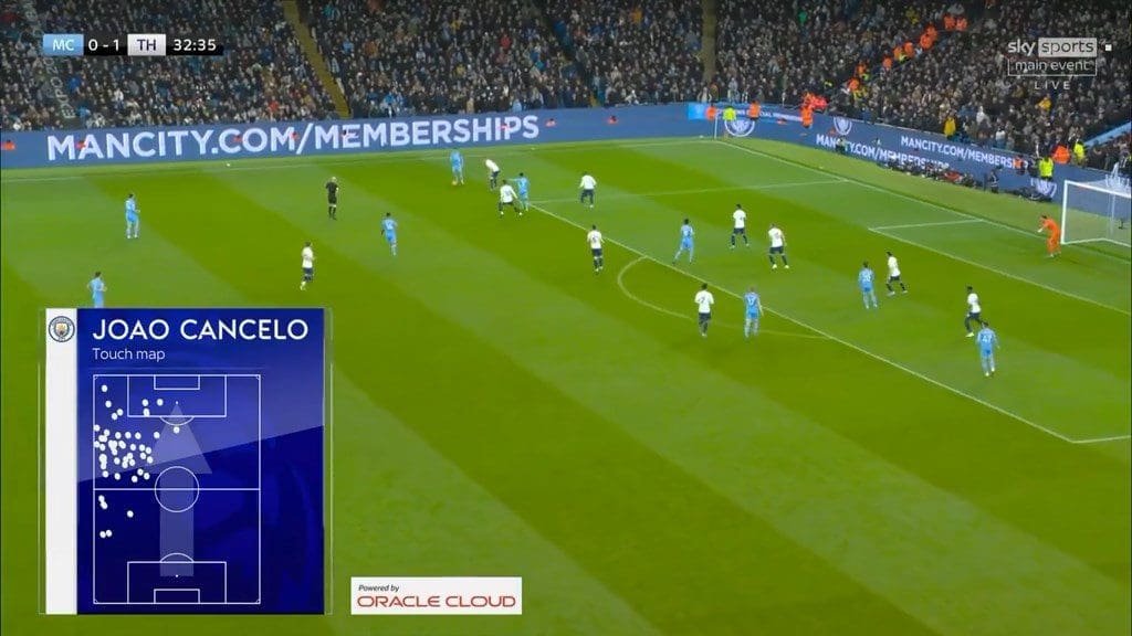 Against Tottenham, Kulusevski and Son’s wide positioning and defensive involvement made it impossible for City to overload either wing-back and City’s left-side combinations was made less threatening. But one way City looked to create danger in these situations was through Cancelo’s ability to take players on and disrupt defences. Since his direct opponent was Kulusevski, direct dribbling was more of an option and he used that as much as he could.