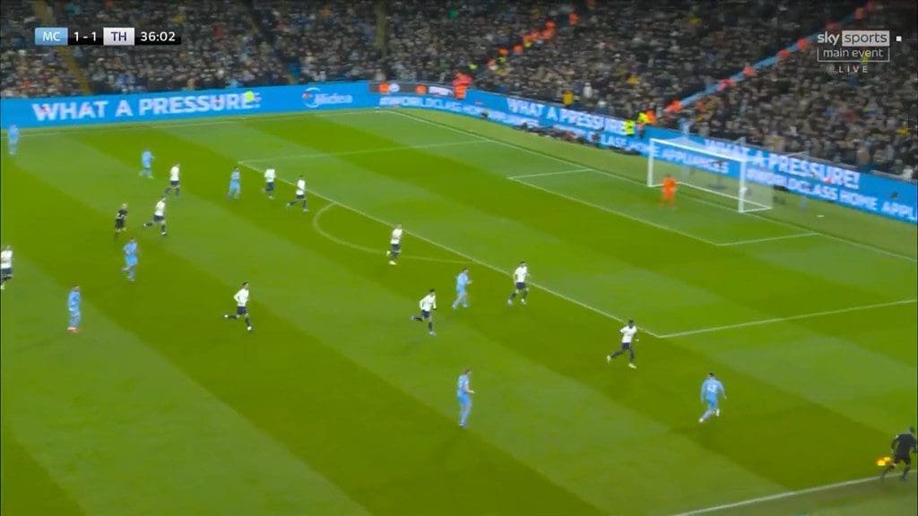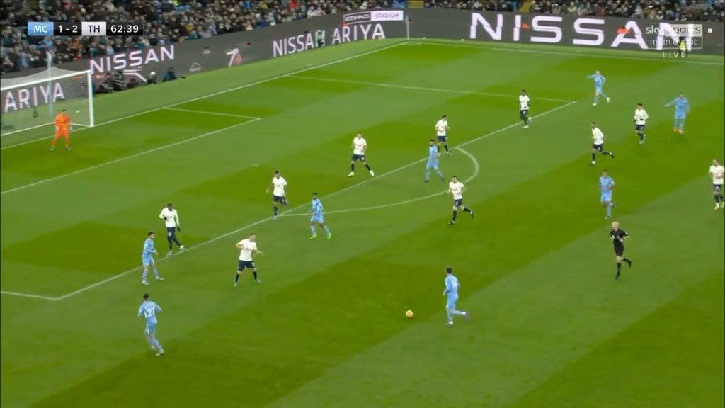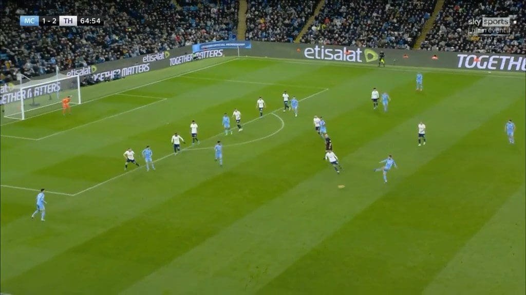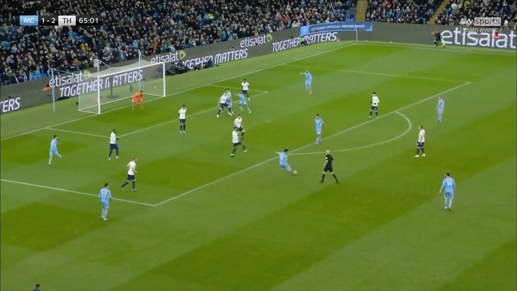 This became more of a tactic in the second half when Mahrez came on and City’s move construction shifted more to the right. The right being Rodri’s strong side meant he was more involved in attacking play, and in so doing took up more offensive positions. Rodri’s involvement attracted attention from Bentancur, and caused Spurs’ midfield line to shift even more to that side. From this dynamic, City could isolate Kulusevski on the far side by switching the play quickly.