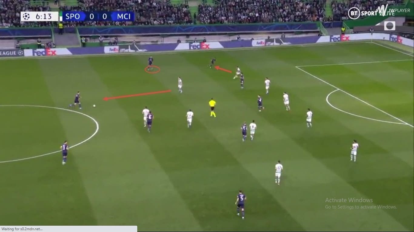 Whenever City play against 3 at-the-back defensive set-ups, positioning one FB or both FB’s wide creates a dilemma for the opponent. Because the opponents mostly press with narrow forwards, Manchester City can overload the opposition wing-back with one wide FB (mostly Cancelo) and the near-side winger for wide combinations. Man City have notably used this against Chelsea and Sporting Lisbon to good effect.