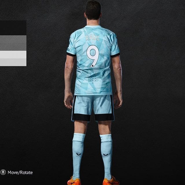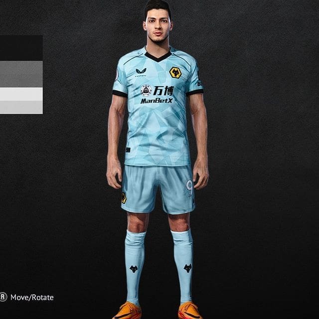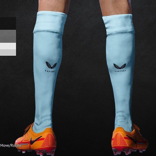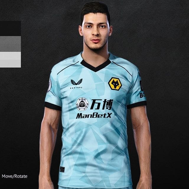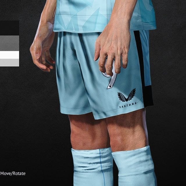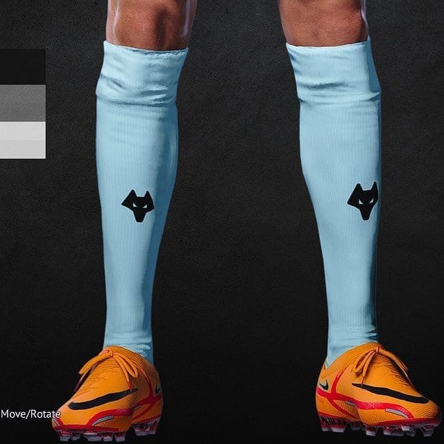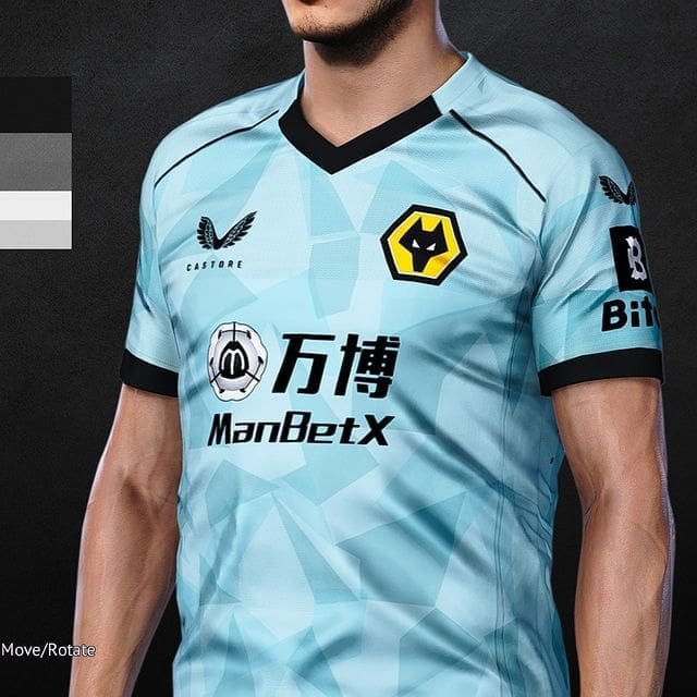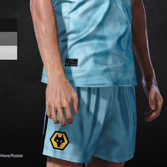 Further moving into Wolves 2022-23 away kit, the Castore Wolverhampton Wanderers F.C. 22-23 away jersey has a classic bespoke look with geometric designs shading between a light-turquoise-blue and black.