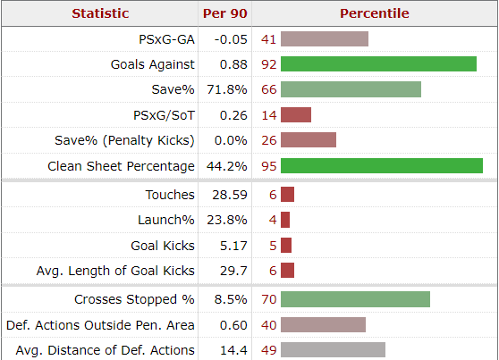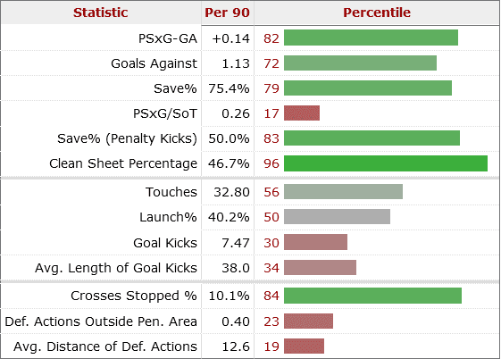One of Edouard’s main problems has been distribution. Slonina’s numbers does suggest that he can solve this problem owing to the ability with the ball at his feet. He also completes 7 Long balls per match compared to the Senegalese shot-stopper’s 3.5 with greater distance covered and with better accuracy as well.