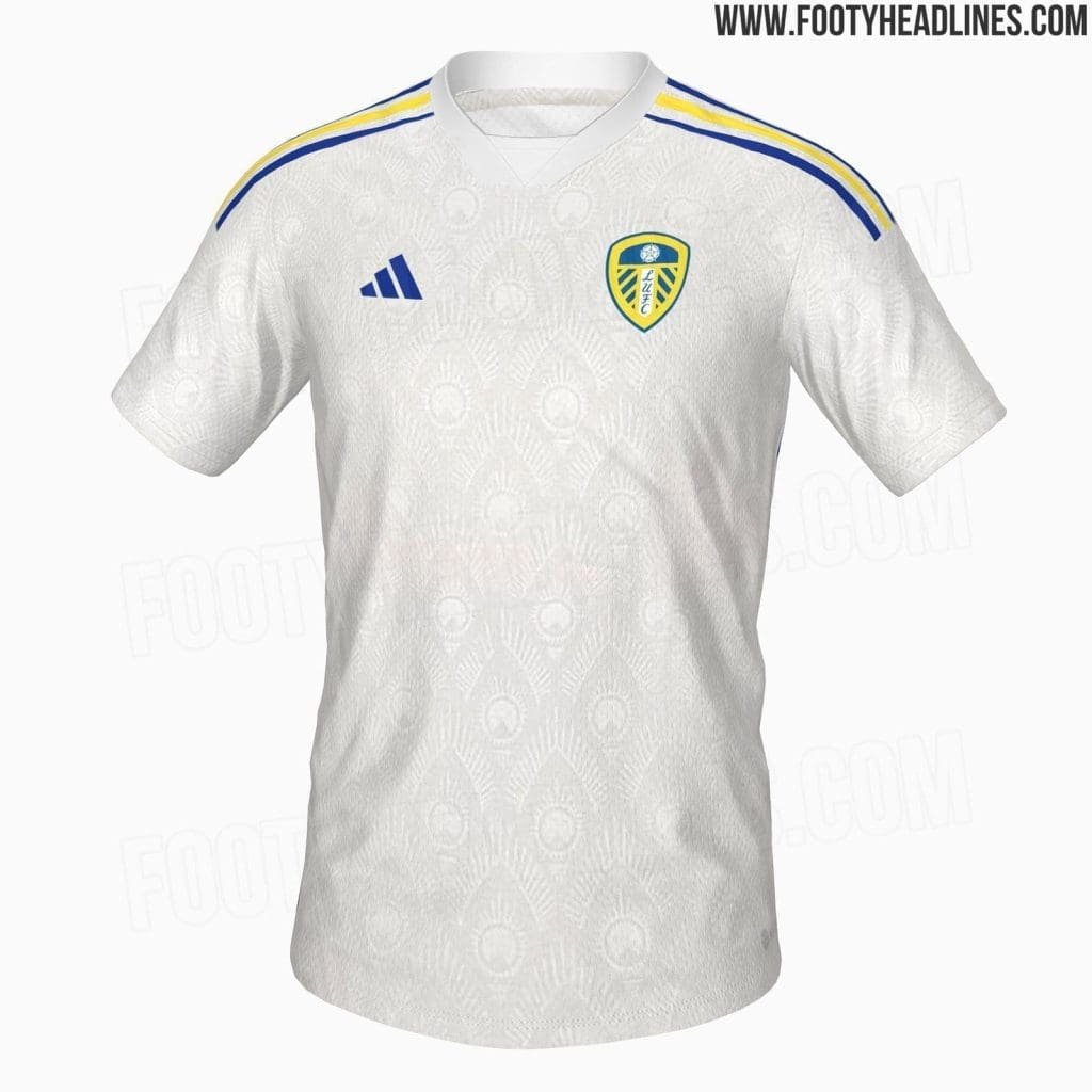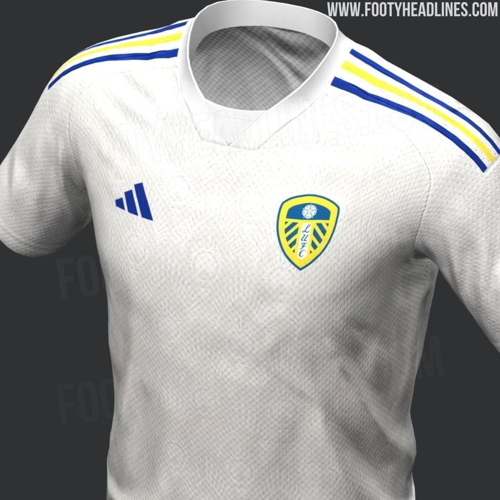Images of Leeds United’s new home kit for the 2023–24 season show the team’s traditional white jersey with blue and yellow trim. Shorts will be white with blue and yellow trim, and the shirt will have a V-neck collar and shoulder stripes of the same colours. In terms of design, the Leeds United home kit has a subtle tonal pattern added.