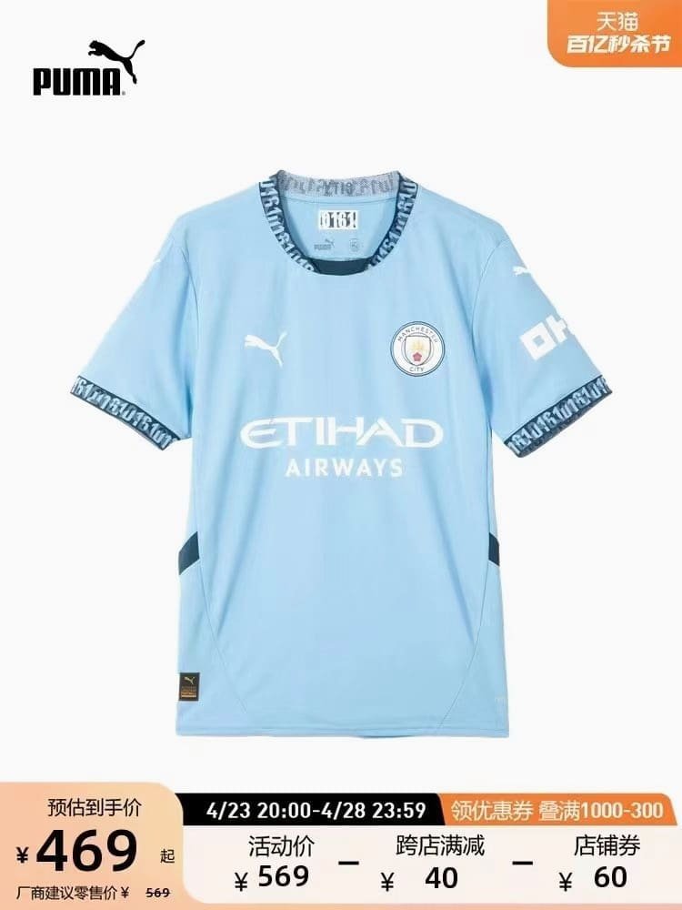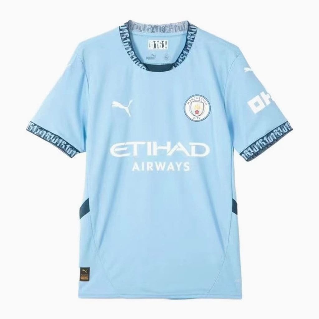 The new Manchester City 2024/25 home shirt stays true to tradition with the classic sky blue color, complemented by crisp white logos and navy accents.